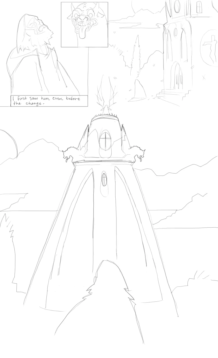 This one, another storyboard for Prologue Games, features the third protagonist and his unsavory meeting with the local church-goers. The disjointedness of the dialogue is because each line is only a brief chunk of the character's full sentence. Thi